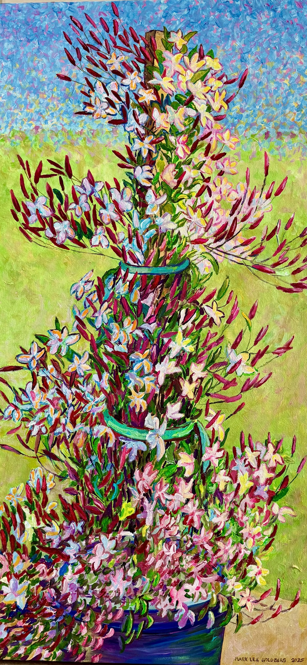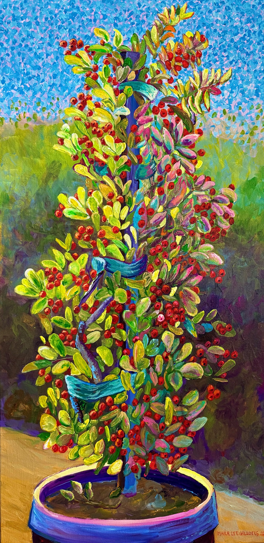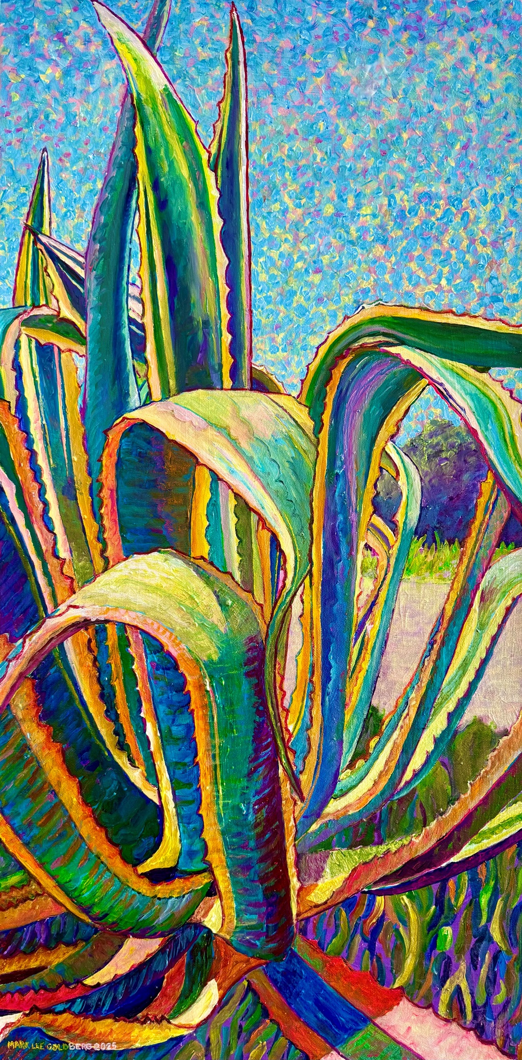 Goldberg’s evolving stylistic technique. Essentially self-taught, Goldberg has shifted from an exacting Realism to a more liberating Impressionism. His unconventional thematic color and compositional techniques have become part of his artistic statement. In doing so he confronts us, quite literally, with the compelling message of his art.